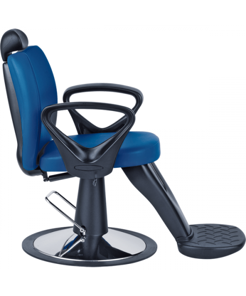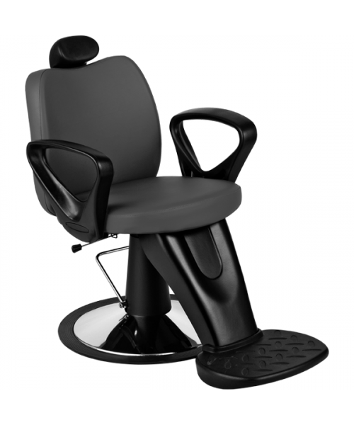 Кресло парикмахерское мужское на диске, выполнено из высококачественного поролона, каркас обтянут искусственной кожей, регулировка высоты гидравлика, с откидывающейся спинкой, выдвижной подголовник, черные пластиковые подлокотники, подножка.