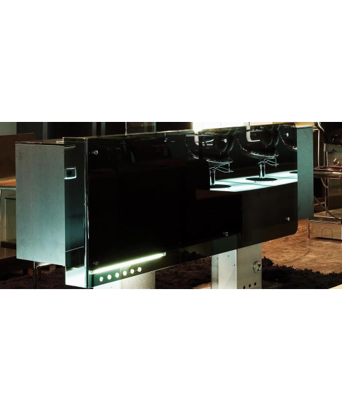 Рецепция прямоугольной формы, выполнена из ламината цвета венге или белого цвета, с четырьмя выдвижными ящиками, на двух металлических ножках. Фасад выполнен из стекла. Возможен вариант с подсветкой.